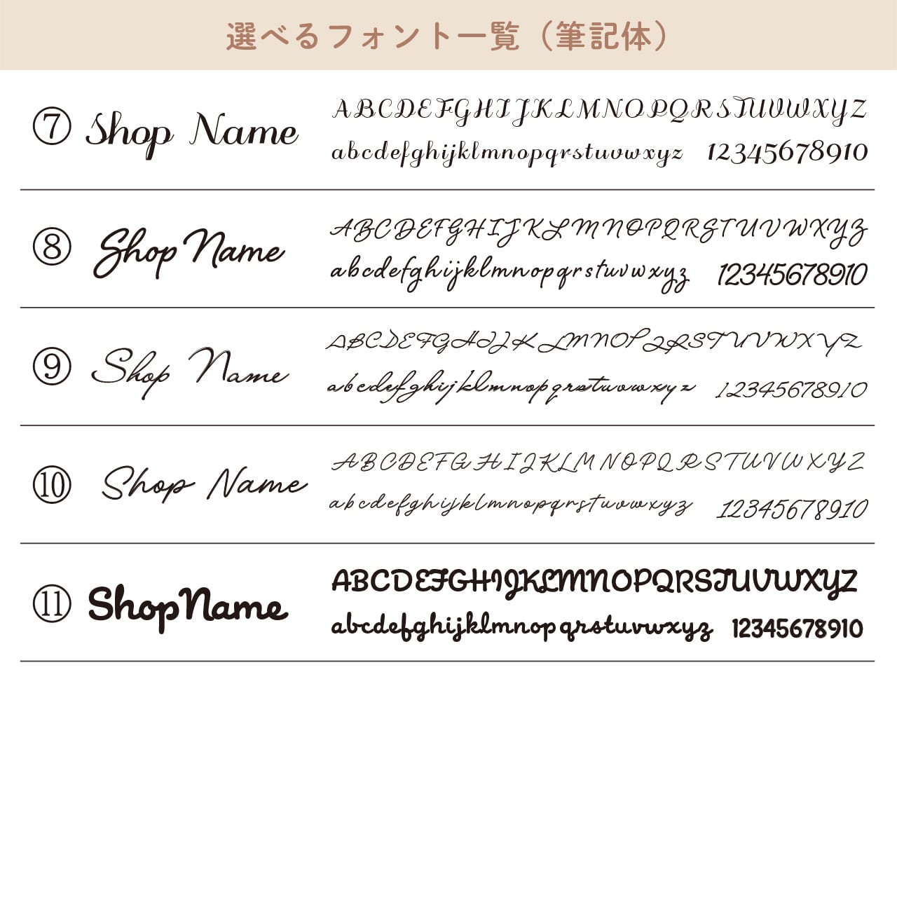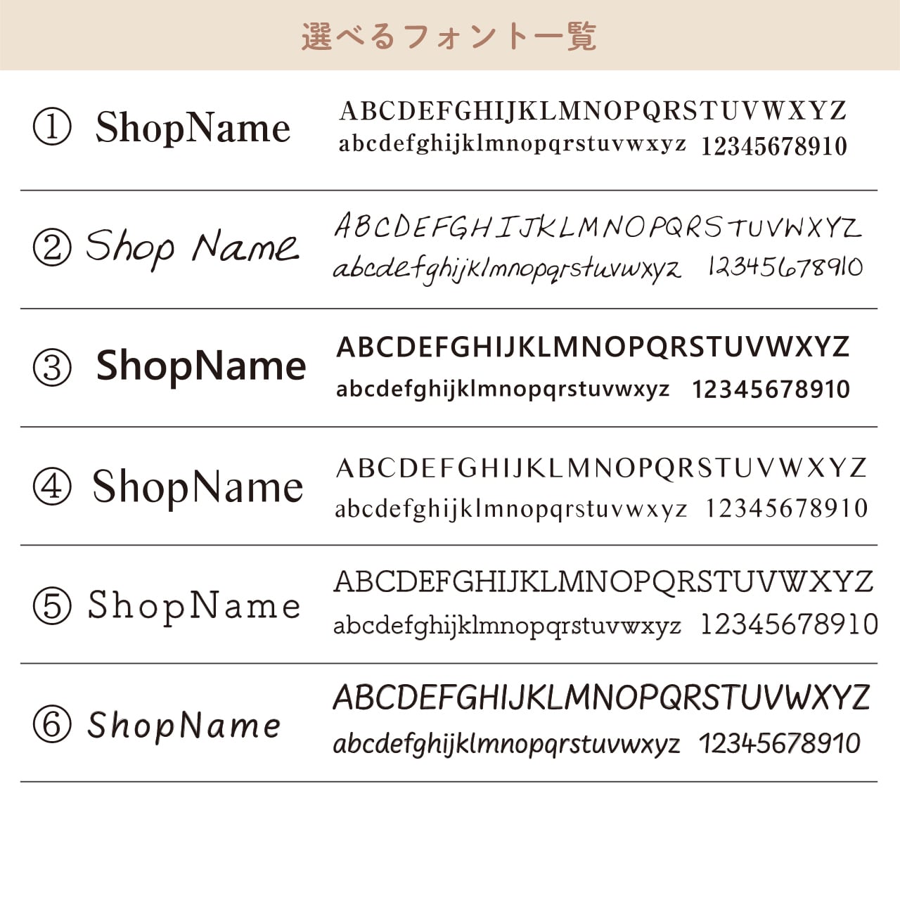 フォント一覧全てにショップ名を打ちこんだ画像をお送りいたしますので、
