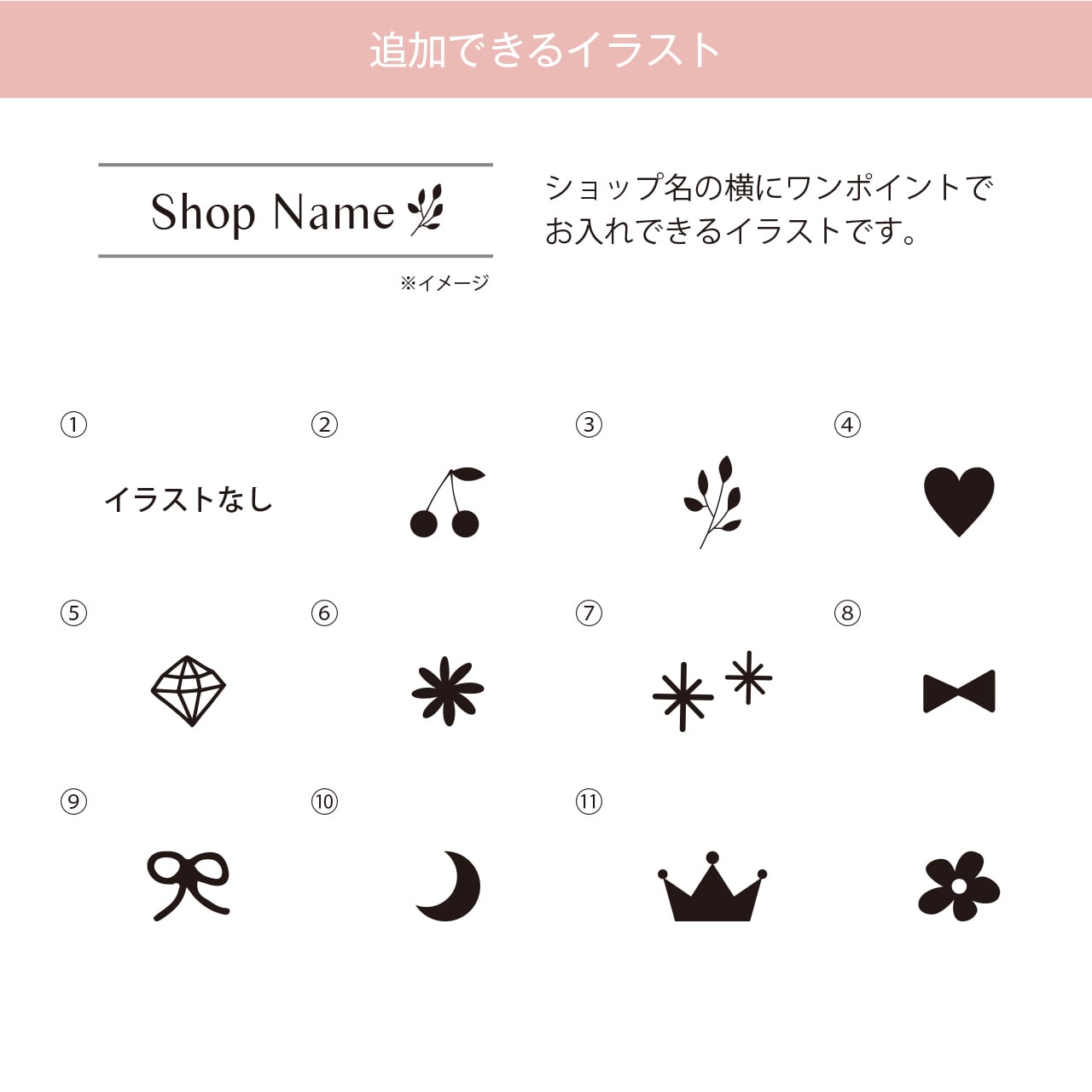 ショップ名など、一番大きな文字の部分のみフォントがお選びいただけます。